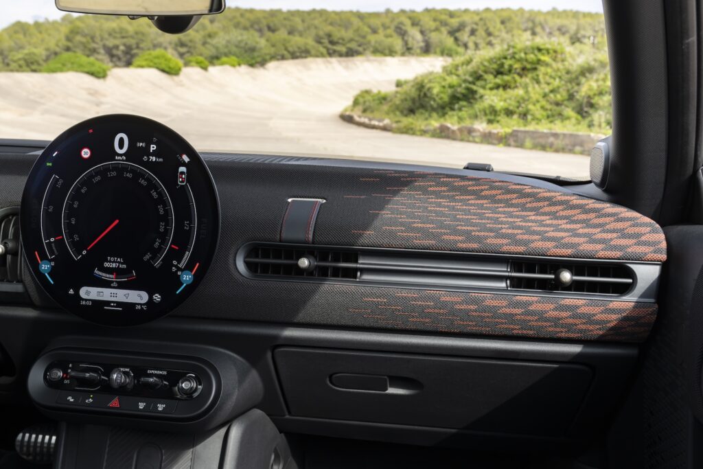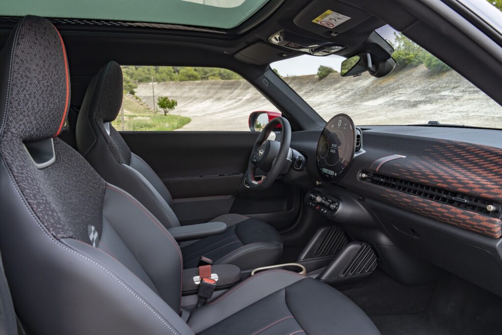 Elektryczny hatchback Mini będzie najszybszy w całej gamie JCW – 5.9 sek. 0-100 km. Aceman jest wolniejszy o pół sekundy w sprincie do setki; przejedzie też o ok. 20 km mniej na jednym ładowaniu baterii (350 km vs. 371 km zasięgu w hatchbacku).