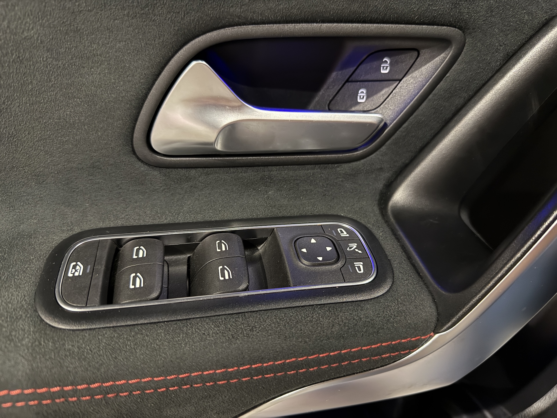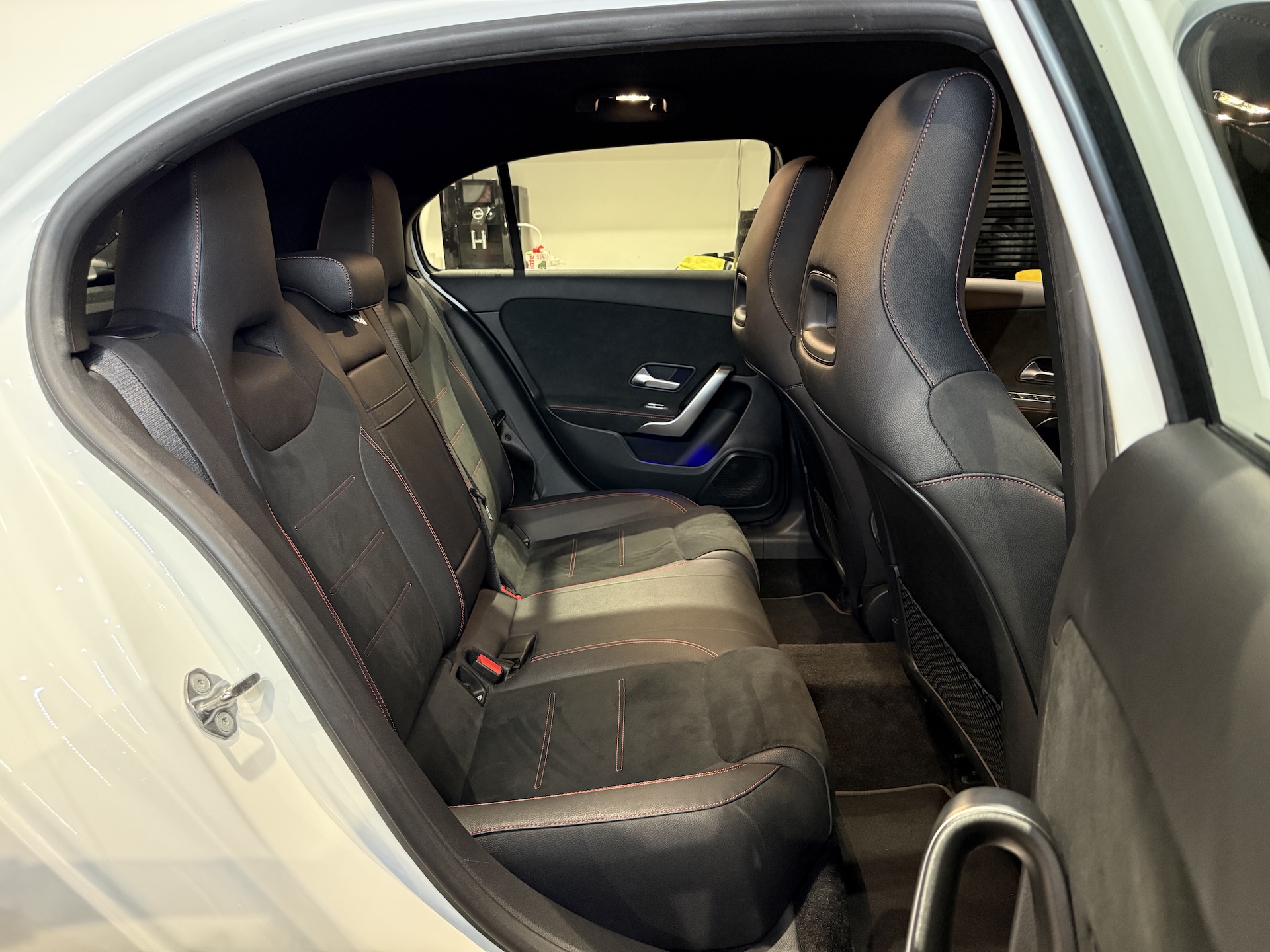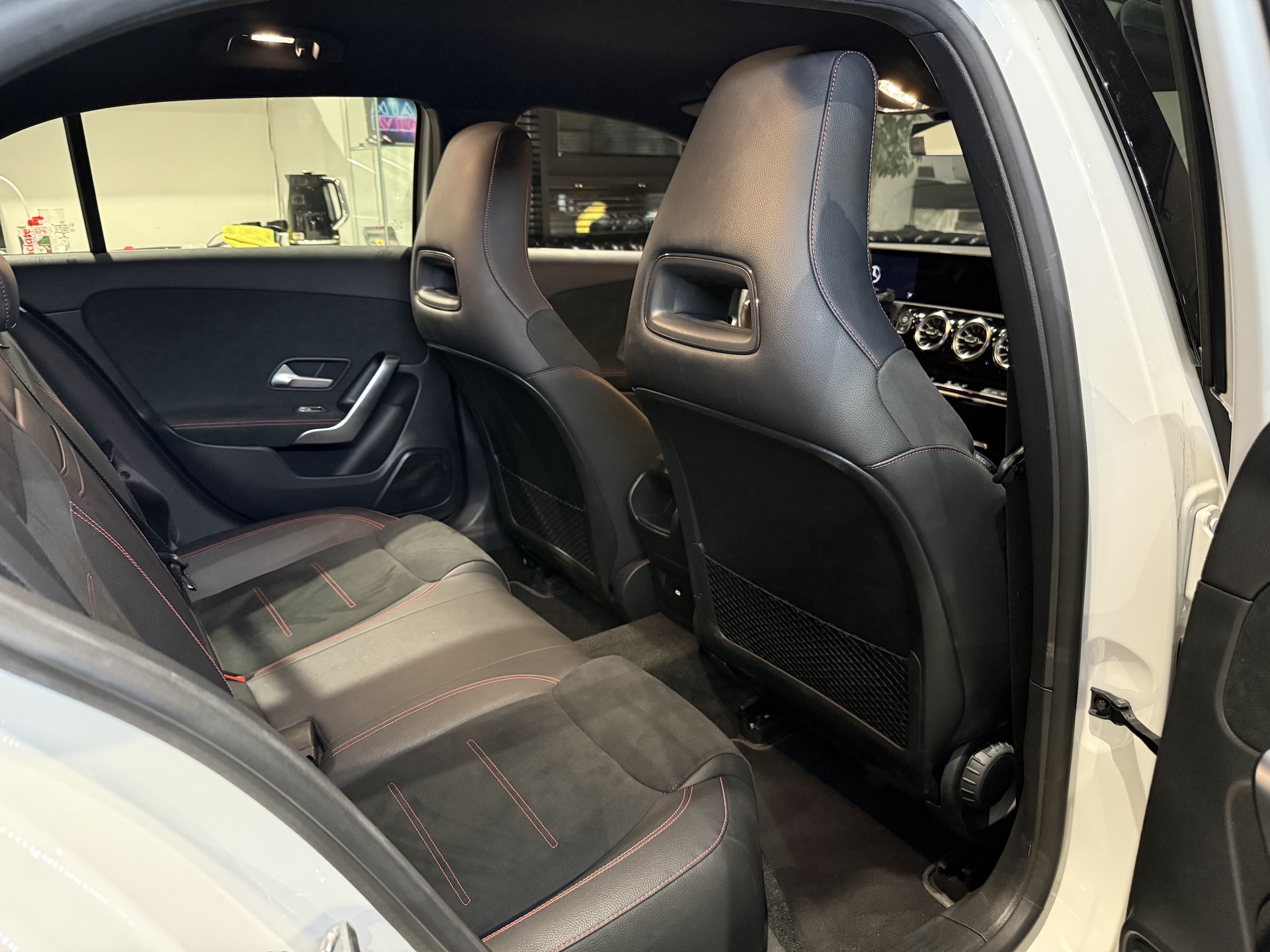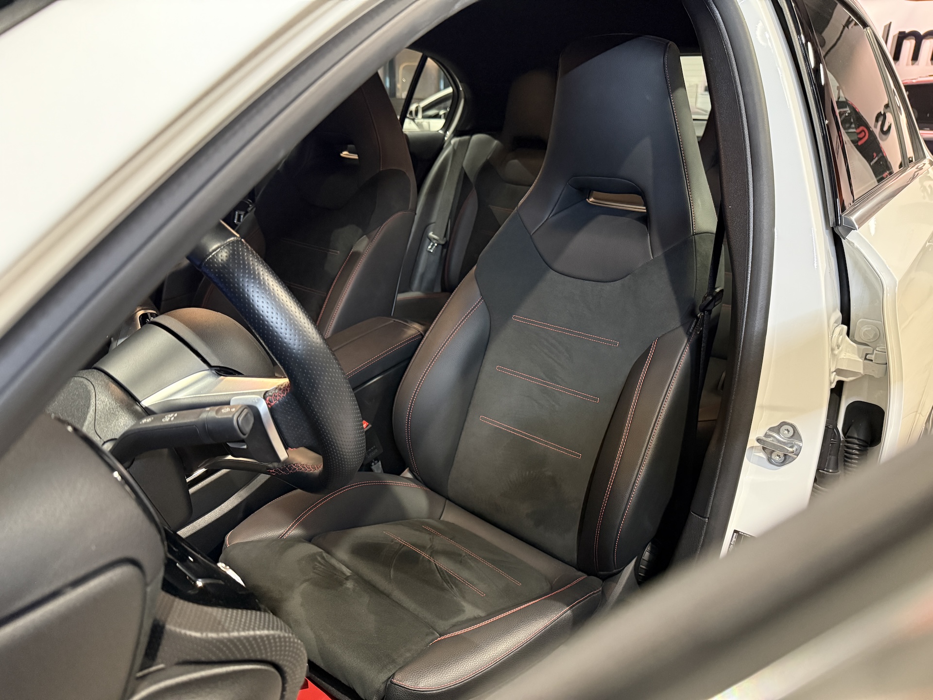 ▫️Tapicerka półskórzana w kolorze czarnym z czerwonymi przeszyciami