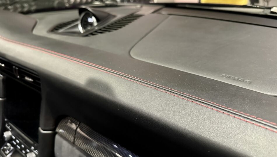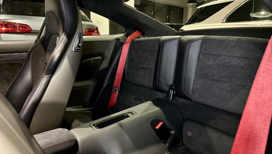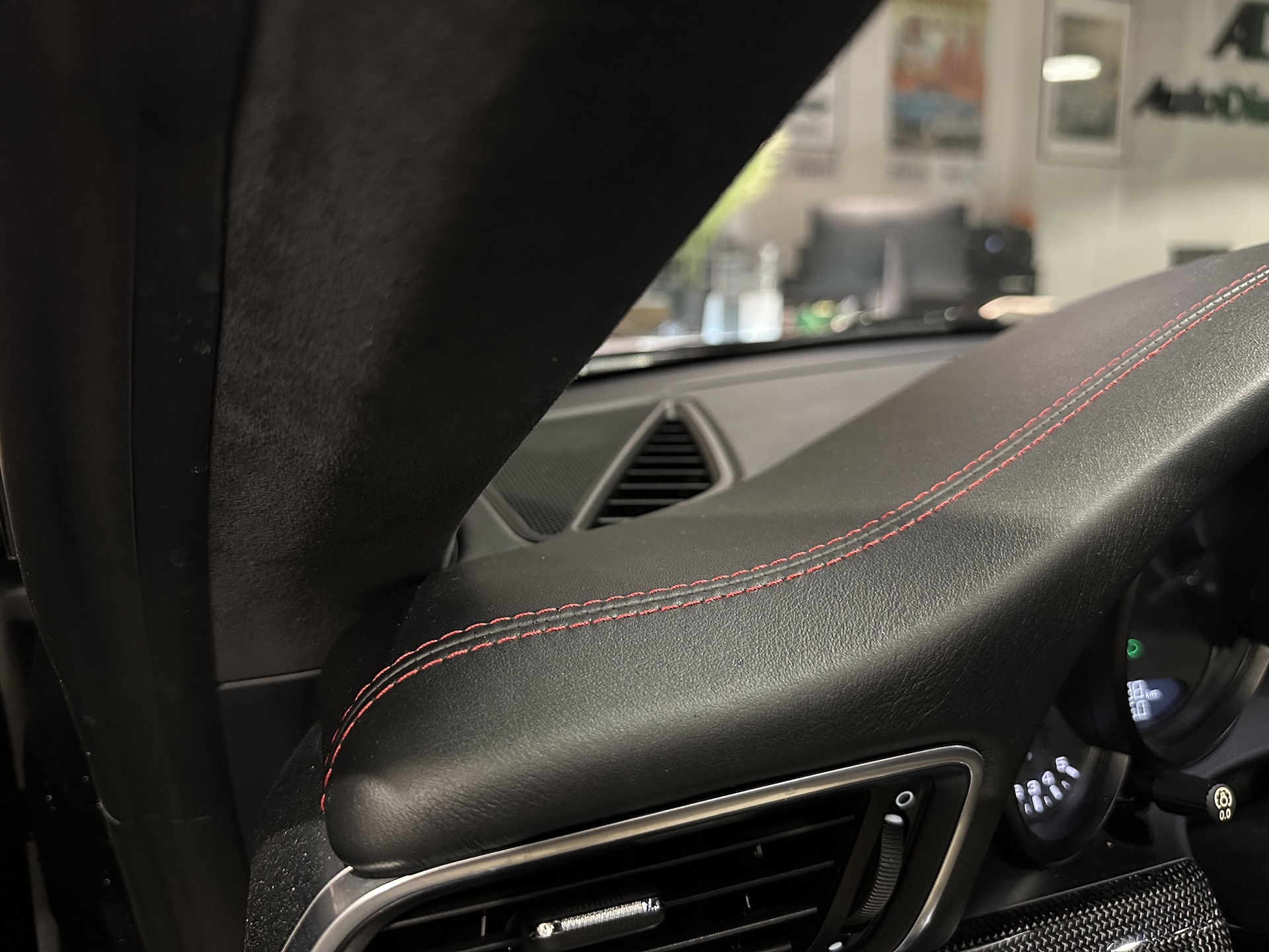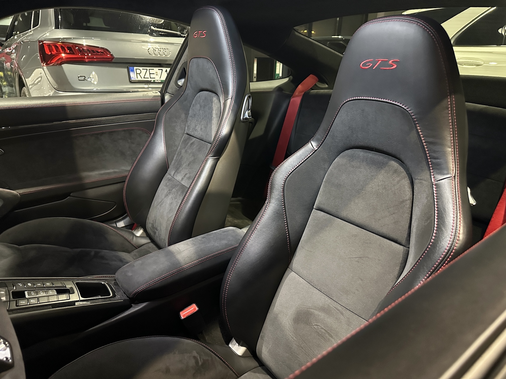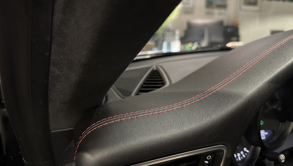 ▫️Tapicerka półskórzana z alcantarą i czerwonymi przeszyciami