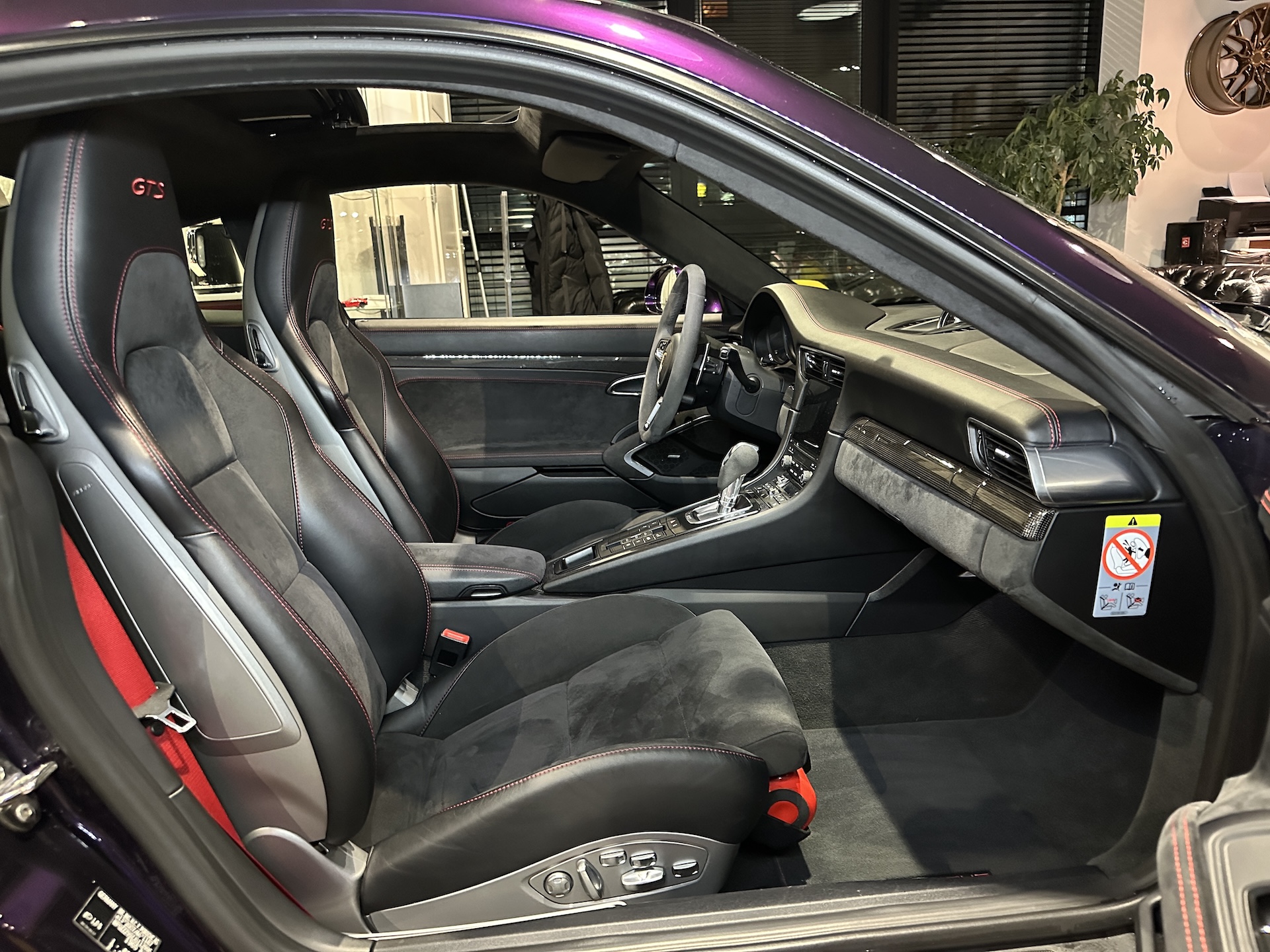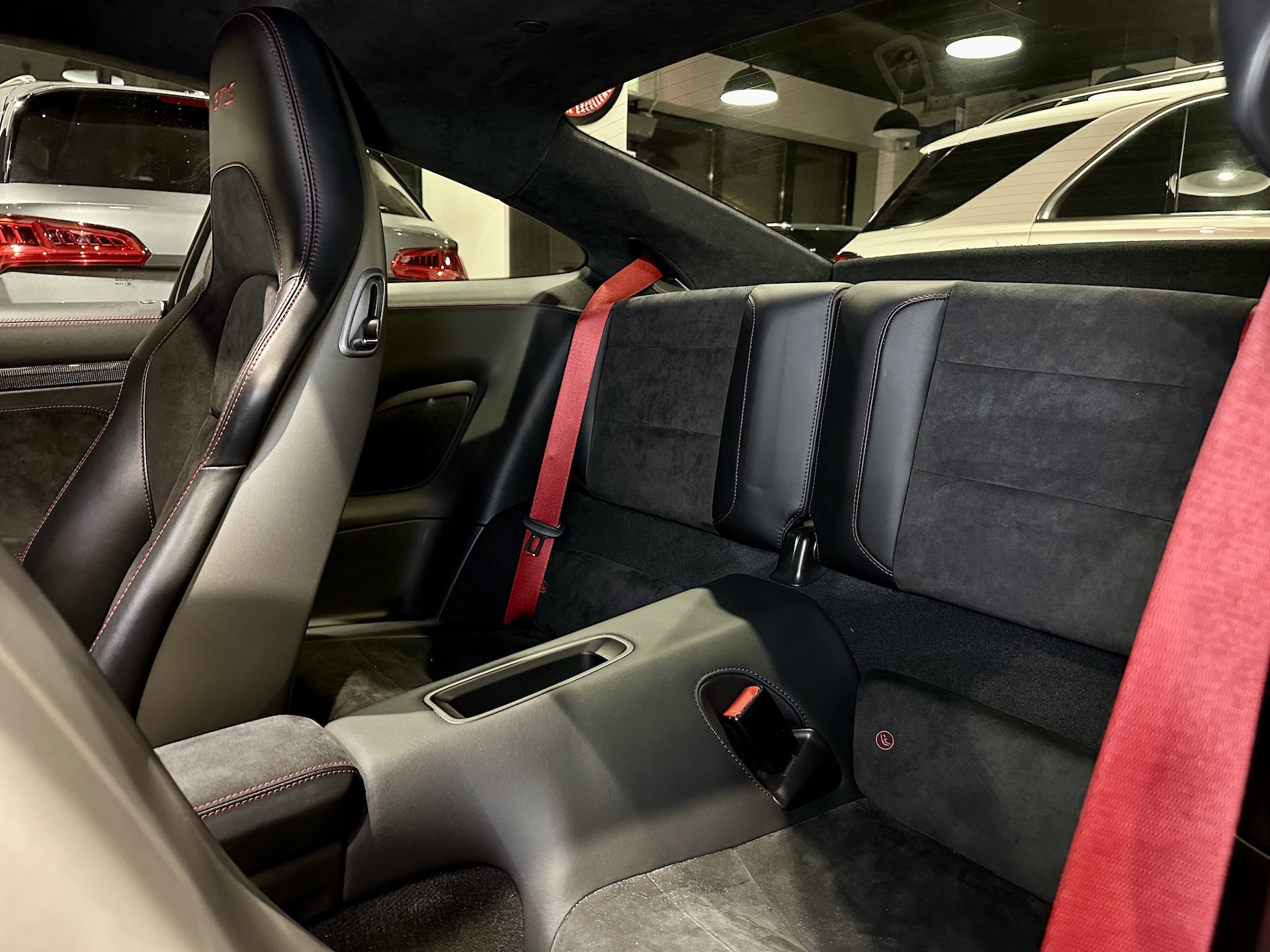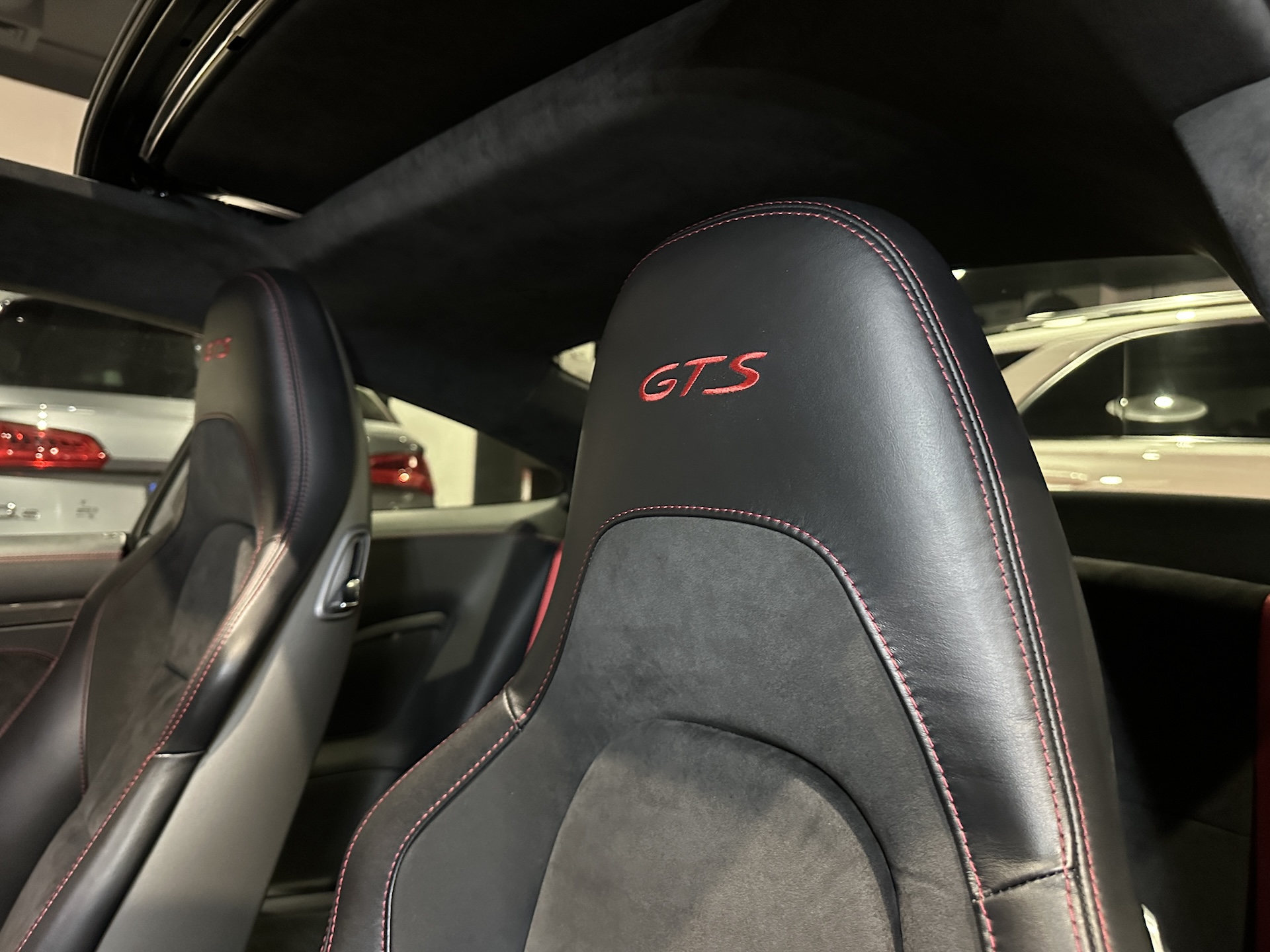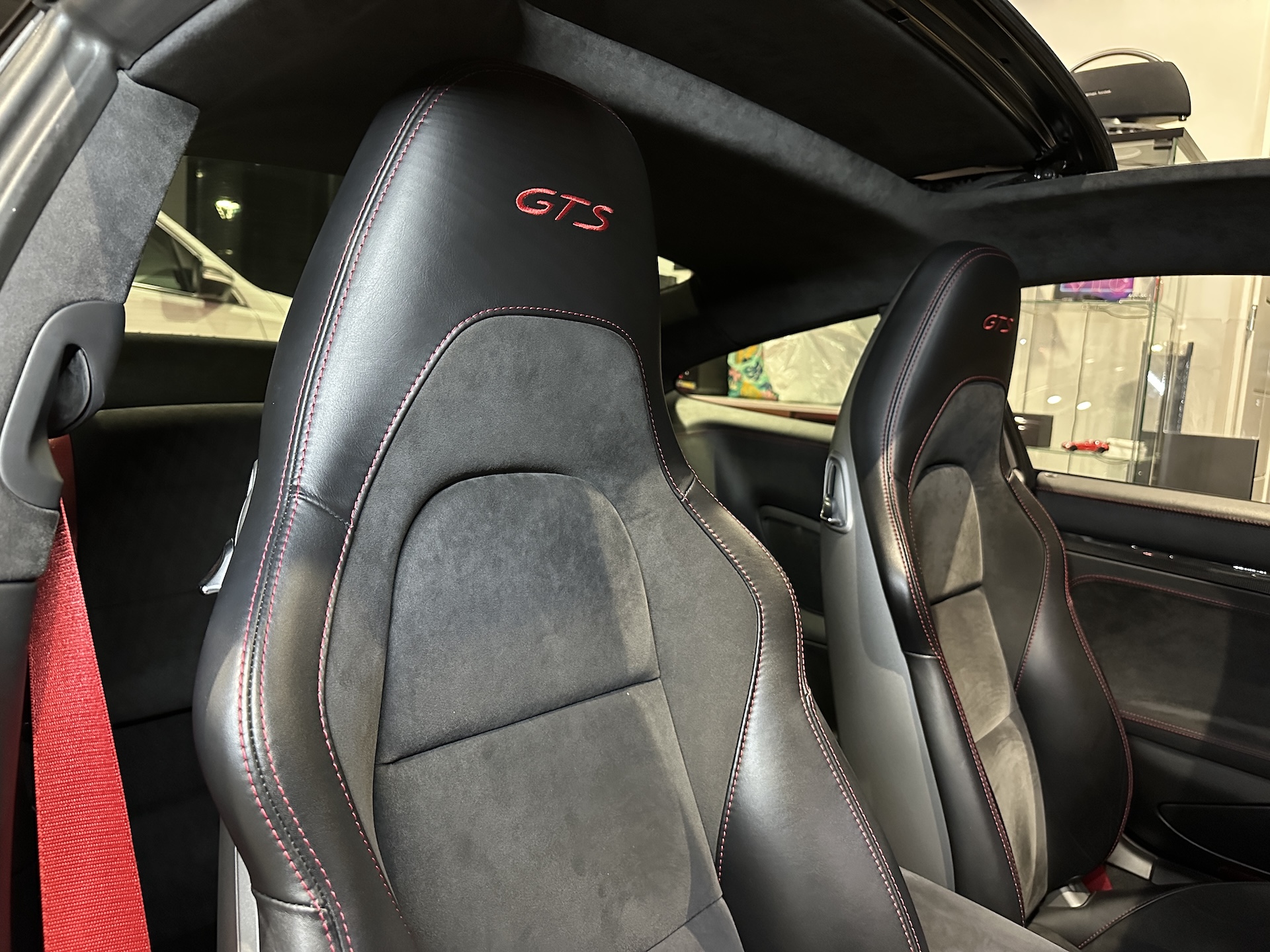 ▫️Tapicerka półskórzana z alcantarą i czerwonymi przeszyciami